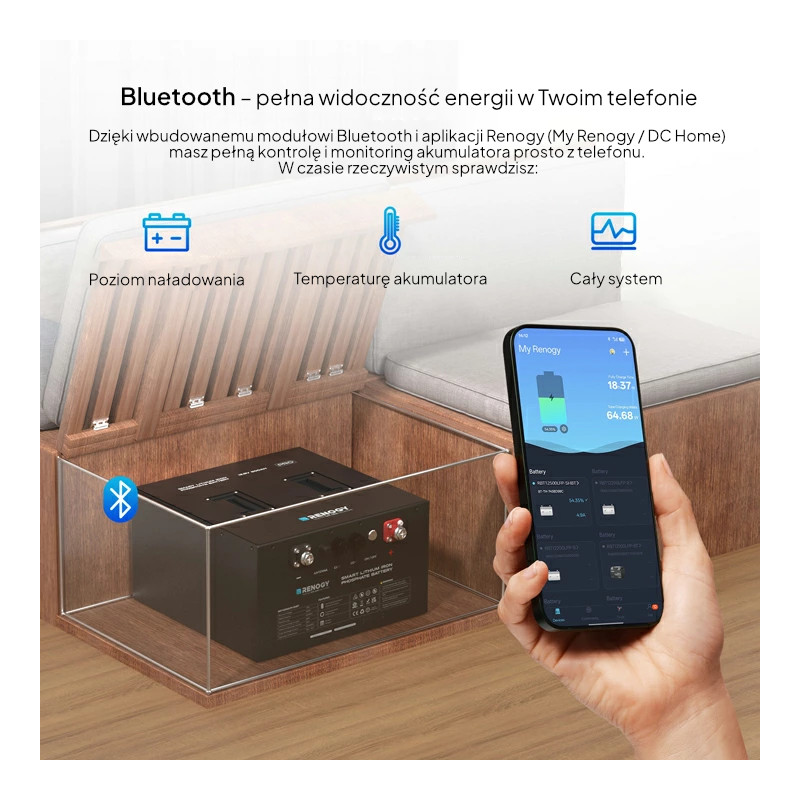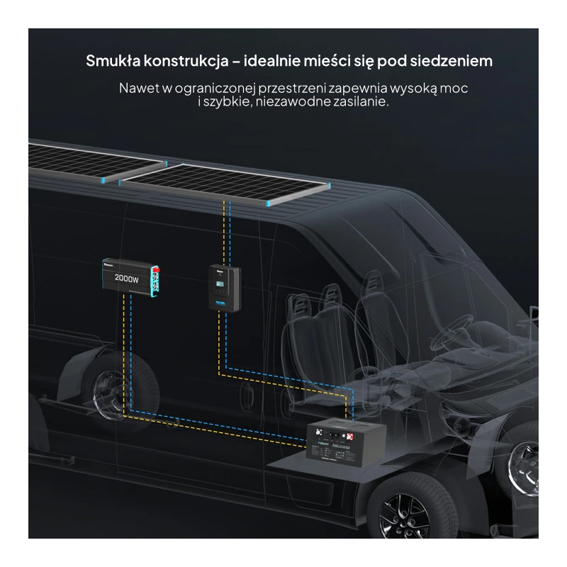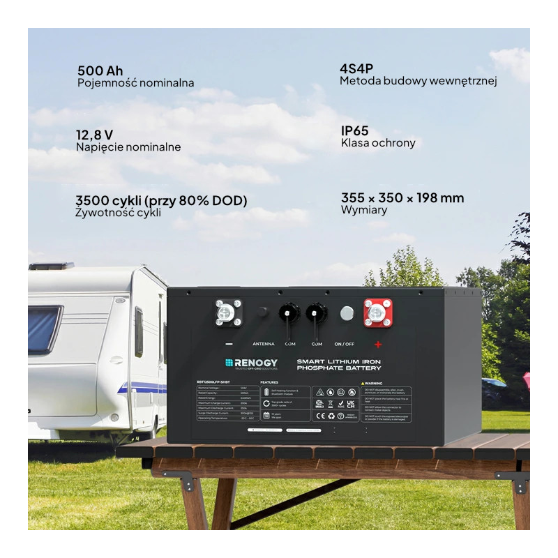 Akumulator Renogy LiFePO4 12,8 V 500 Ah Pro Smart to inteligentna, kompaktowa bateria litowo-żelazowo-fosforanowa zaprojektowana specjalnie do kamperów, vanów, łodzi i systemów off-grid. Dzięki smukłej obudowie (355 × 350 × 198 mm) idealnie mieści się pod siedzeniem w większości pojazdów kempingowych, waży zaledwie 1/3 wagi klasycznych akumulatorów ołowiowych, oferuje realną pojemność ~530 Ah (6400 Wh), ponad 3500 cykli przy 80% DOD, ciągły prąd rozładowania 250 A oraz funkcję samonagrzewania, która umożliwia bezpieczne ładowanie nawet w mrozie.