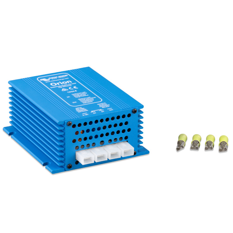 Jednym z kluczowych atutów tego urządzenia jest wbudowany wyłącznik „on-off”, który eliminuje potrzebę stosowania przełącznika wysokiego napięcia w obwodzie wejściowym. Możliwość sterowania wyłącznikiem niskonapięciowym lub przełącznikiem silnika typu „run/stop” zwiększa jego funkcjonalność i ułatwia integrację w bardziej złożonych systemach zasilania. Ponadto, Orion 12/24-8 może służyć jako ładowarka akumulatorów, co czyni go wszechstronnym narzędziem w systemach 12V i 24V. Dodatkowo, konwerter ten może być stosowany w połączeniach równoległych, umożliwiając zwiększenie wydajności systemu.